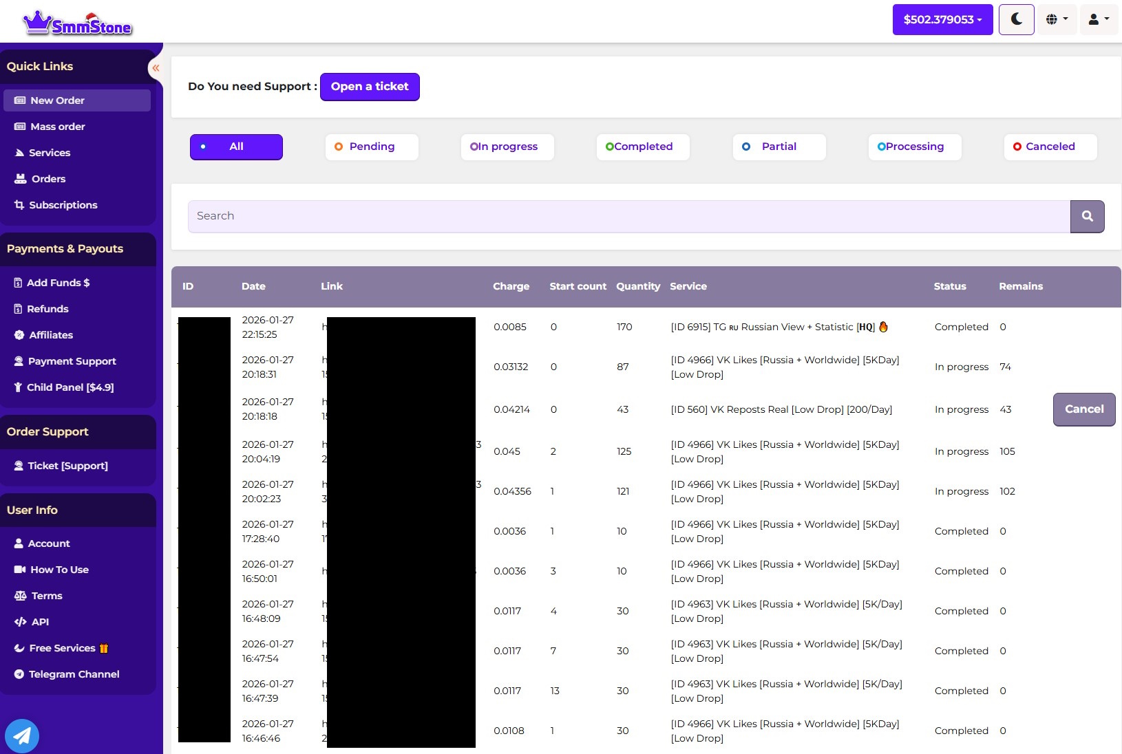 Регулярно закупаюсь на smmstone. Очень много услуг, правда не все всегда стабильно отрабатывают. В поддержке (тикетах) раньше отвечали так как будто "лишь бы отстали" от них, но со временем создали отдельную группу в телеграм (после определённых трат), где более оперативно стали решать вопросы. В среднем 7 из 10 заказов отменяют сами быстро (если долго не запускаются), некоторые приходится долго ждать (доходило и до недели), как понял тоже зависит от услуг (собственные услуги или те что перепродают). Рекомендую перед большими объёмами всегда тестировать на небольших количествах, и если услуга хорошо сработала - только тогда заказывать более крупные заказы. Есть также уникальные услуги, которых не видел у других поставщиков смм услуг.